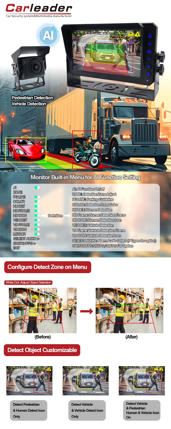 Carleader 7 လက်မ AI BSD Blind Spot Detection Monitoring System Support AI Calibration ကို အဆင့်မြင့် AI တိကျမှုမြင့်မားသော algorithms နှင့် အသုံးပြုရလွယ်ကူသော menu cz လုပ်ဆောင်ချက်ဖြင့် ဒီဇိုင်းပြုလုပ်ထားသည်။ ဤ AI ကင်မရာစနစ်သည် ယာဉ်မောင်းများအား ရာသီဥတုမရွေး၊ တိကျသေချာသော လမ်းသွားလမ်းလာများနှင့် ယာဉ်တိုက်မှုဆိုင်ရာ သတိပေးချက်များကို ပံ့ပိုးပေးကာ ယာဉ်မတော်တဆဖြစ်နိုင်ခြေကို ထိရောက်စွာ လျှော့ချပေးပါသည်။ AI စောင့်ကြည့်ကင်မရာစနစ်သည် ကိုယ်ပိုင်ကားများ၊ လုပ်ငန်းသုံးယာဉ်များနှင့် အထူးယာဉ်များအတွက် သင့်လျော်သည်။ ရေယာဉ်စု AI စနစ်တွင် ခိုင်မာသောပေါင်းစပ်မှုနှင့် လိုက်ဖက်ညီမှု၊ တာရှည်ခံမှုနှင့် အချိန်နှင့်တပြေးညီ စောင့်ကြည့်ရေးစွမ်းရည်များ ပါဝင်သည်။