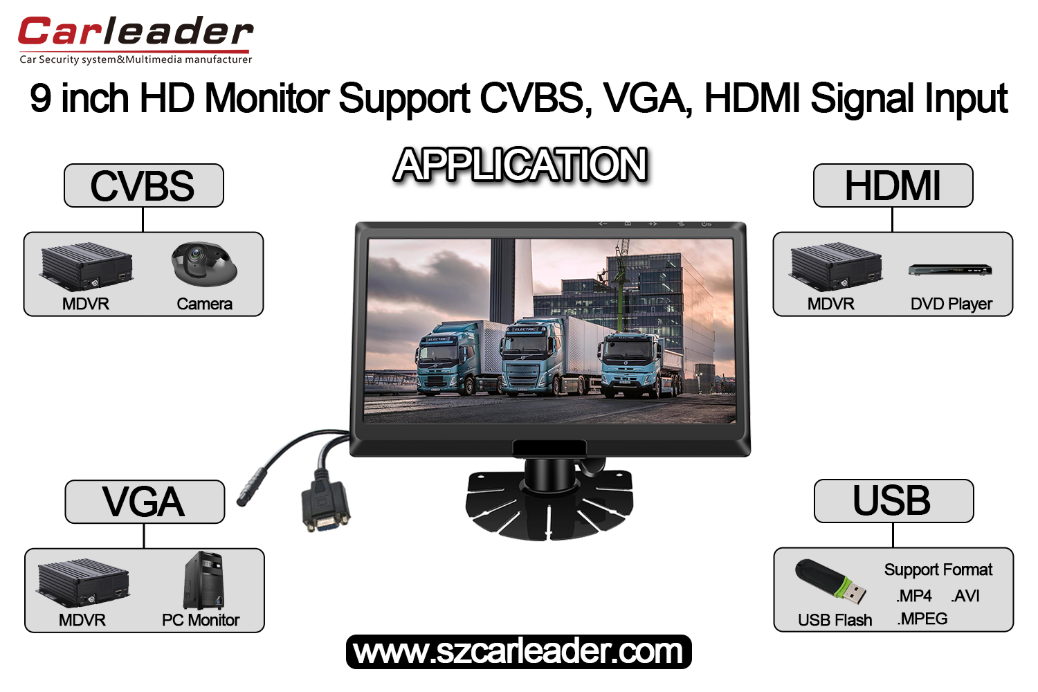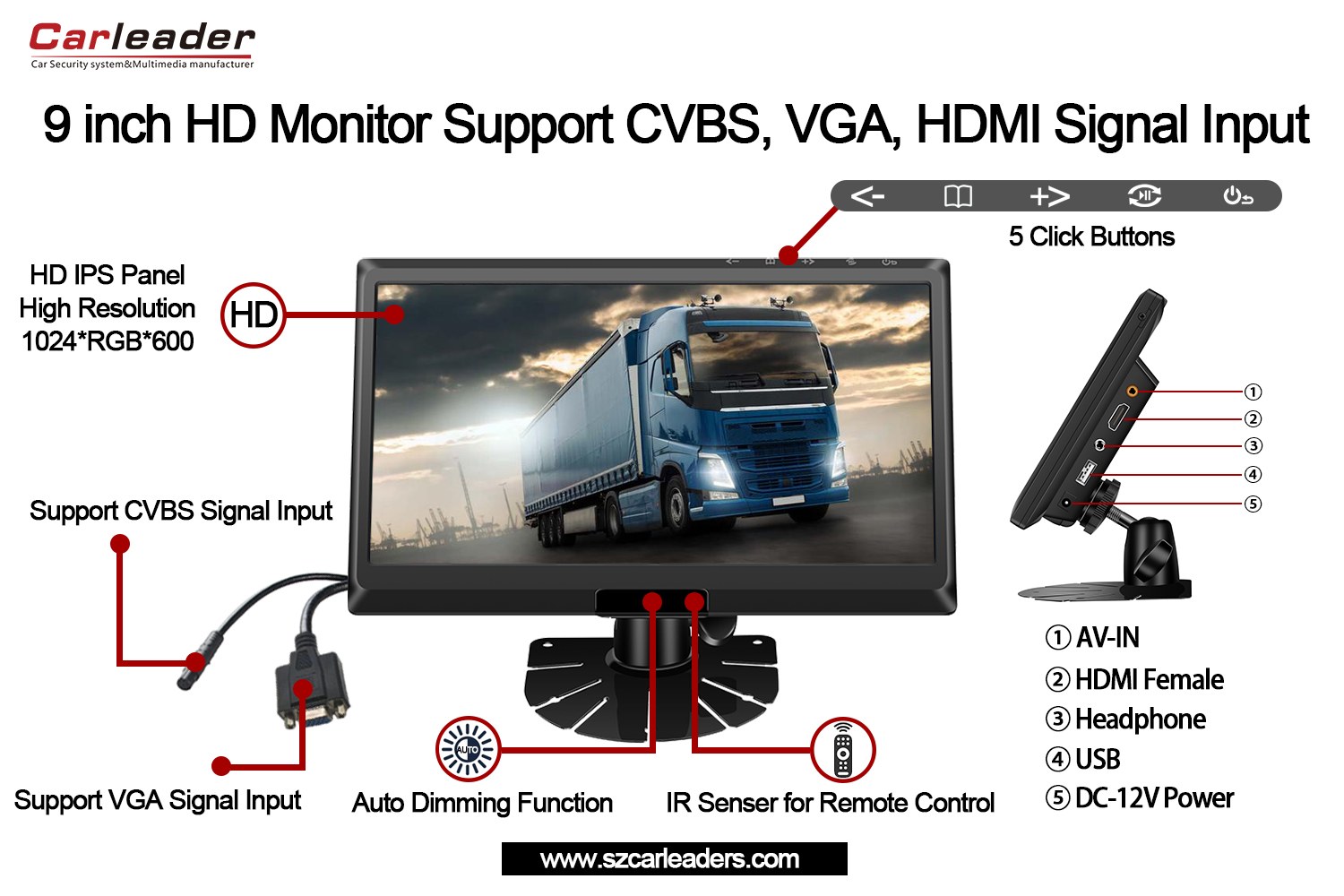 ကားခေါင်းဆောင်9 လက်မ IPS မျက်နှာပြင် HD Monitor CVBS+HD+VGA ထည့်သွင်းမှုများကို ပံ့ပိုးပေးသည်။ယာဉ်စောင့်ကြည့်ခြင်းနှင့် MDVR ရေယာဉ်စုစီမံခန့်ခွဲမှုအတွက် စွမ်းဆောင်ရည်မြင့် HD မော်နီတာတစ်ခုဖြစ်သည်။ ကားမော်နီတာသည် CVBS၊ HD နှင့် VGA အချက်ပြထည့်သွင်းမှုများကို ပံ့ပိုးပေးသည်။ MDVR တွင် VGA သို့မဟုတ် HD ကြားခံပါရှိပါက၊ 9 လက်မ IPS မျက်နှာပြင်ကားမော်နီတာဖြင့်အသုံးပြုနိုင်ပါသည်။