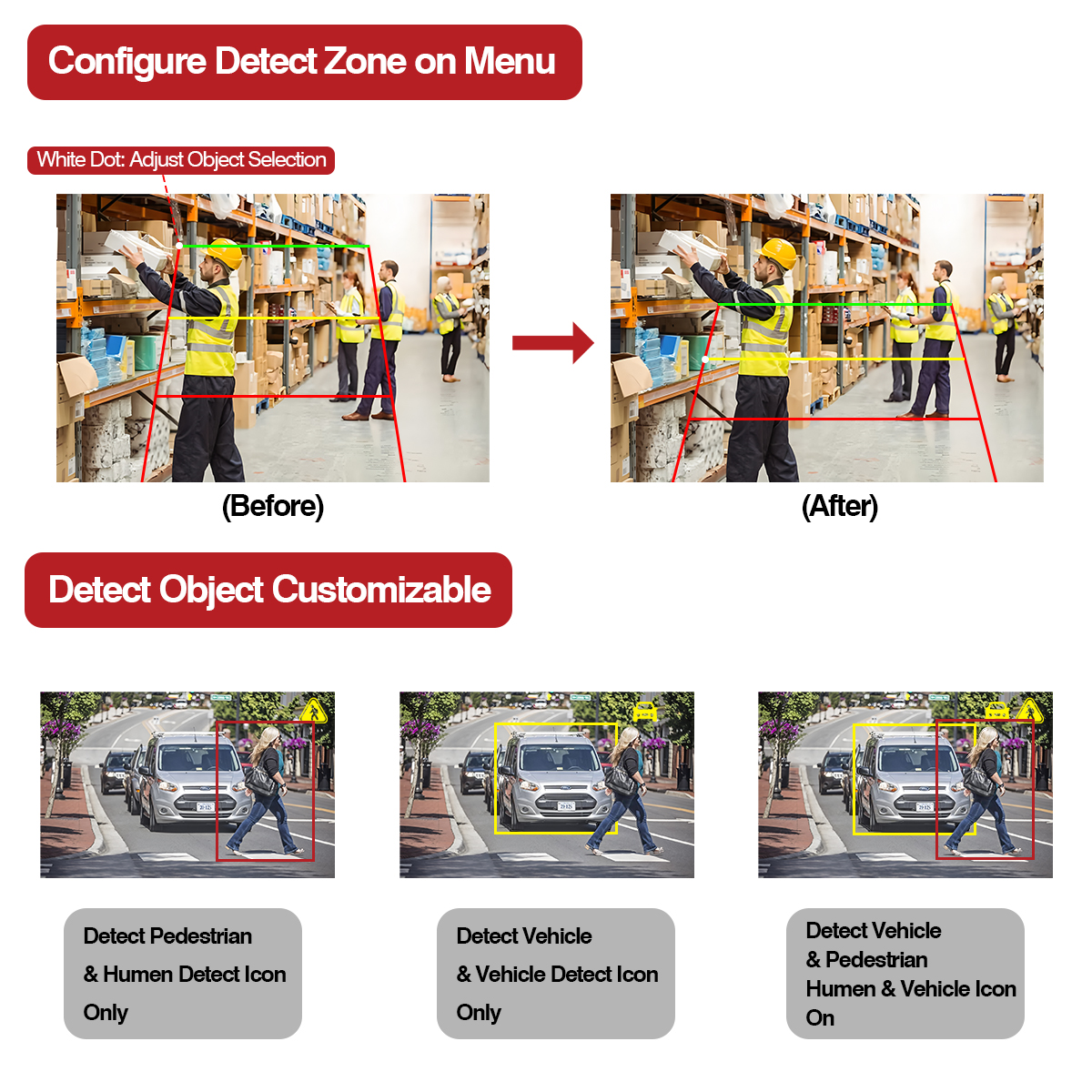 အာရုံခံအရာဝတ္တုသည် မတူညီသော ထောက်လှမ်းမှုဧရိယာ (အနီ၊ အဝါ၊ အစိမ်း) အတွင်းသို့ ဝင်ရောက်သောအခါတွင် တပ်ဆင်ထားသည့် သတိပေးချက်အလင်းလုပ်ဆောင်ချက်ပါရှိသော ဤ AI ကင်မရာသည် အလင်းအရောင်သို့ ပြောင်းလဲသွားမည်ဖြစ်သည်။ သင့်ယာဉ်နှင့် နီးကပ်လာနေသော လမ်းသွားလမ်းလာများနှင့် ပတ်ဝန်းကျင်ရှိ လမ်းသွားလမ်းလာများအတွက် အချက်ပေးနှိုးဆော်သံနှင့်လည်း ပေါင်းစပ်ပါ။