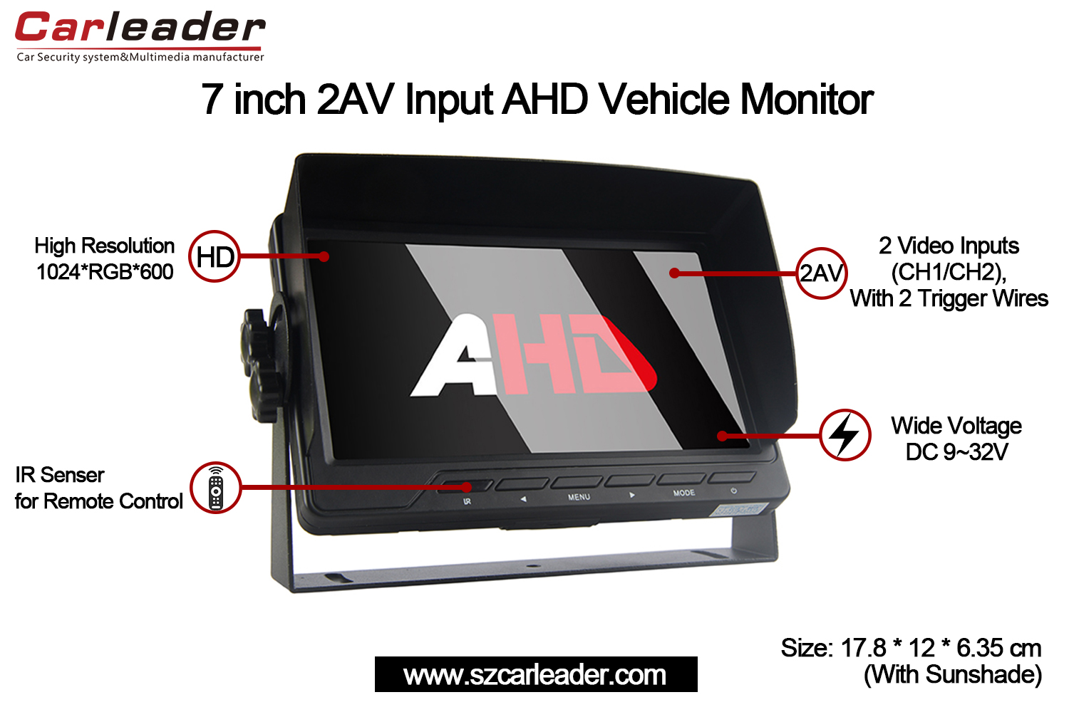 ကားခေါင်းဆောင်7 လက်မ AHD 2CH Input Vehicle Monitorကျစ်လျစ်ပြီး တာရှည်ခံသော ဒီဇိုင်းဖြင့် ယုံကြည်စိတ်ချရမှု၊ ပြတ်သားမှုနှင့် ဘက်စုံသုံးနိုင်မှုတို့ကို ပေါင်းစပ်ထားသောကြောင့် ၎င်းသည် ပရော်ဖက်ရှင်နယ်နှင့် ကိုယ်ပိုင်ယာဉ်စောင့်ကြည့်မှုလိုအပ်ချက်များအတွက် အကောင်းဆုံးရွေးချယ်မှုဖြစ်စေသည်။