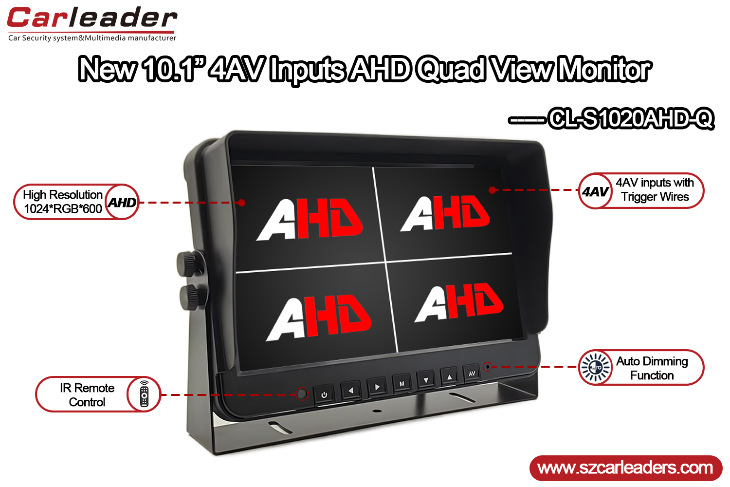မော်တော်ယာဉ်၊ လုံခြုံရေး၊ နှင့် စက်မှုကြီးကြပ်ရေးအက်ပလီကေးရှင်းများအတွက် စံပြ၊ကားခေါင်းဆောင်10.1 လက်မ 4CH Quad Display Heavy Duty Vehicle AHD Monitorခိုင်ခံ့သော လုပ်ဆောင်နိုင်စွမ်း၊ ကြည်လင်ပြတ်သားသော မျက်နှာပြင် အရည်အသွေးနှင့် အသုံးပြုသူ-ပြင်ဆင်နိုင်သော ရွေးချယ်စရာများကို ကျစ်လစ်ပြီး တာရှည်ခံသော ပက်ကေ့ခ်ျတွင် ပေါင်းစပ်ထားသည်။
